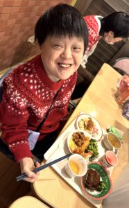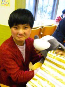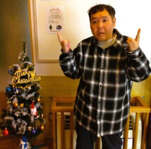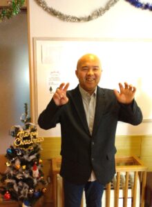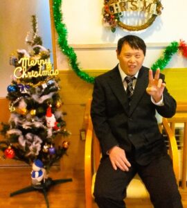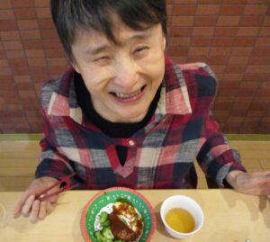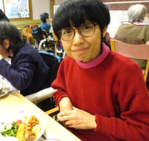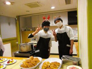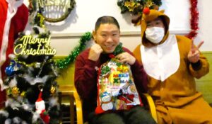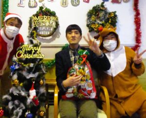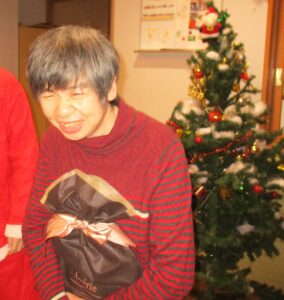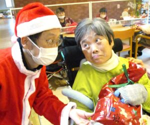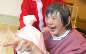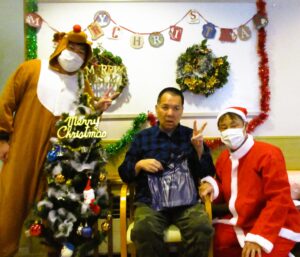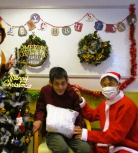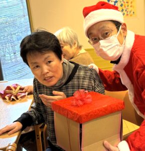 午後から夜にかけて、クリスマス会を開催しました。午後は、皆さんお待ちかねのサンタさんとトナカイによるお一人おひとりへのプレゼントタイムから始まりました。「次はだれかな」「自分かな」とわくわくしつつ、喜ばれていました。プレゼントのお渡しの後は、サンタさんとの写真撮影会が始まりました。夜はクリスマスディナーの開始。調理員が一つ一つ丁寧に仕上げた手作りのハンバーグに唐揚げ、エビフライにスパゲッティ、特製サンタさんのポテトサラダと今年も盛りだくさんのクリスマスメニューでした。クリスマスケーキの代わりに、3種のデザートとフルートのアシェットも出て、皆さんお腹いっぱいの笑顔を見せて下さっていました。 副施設長 小森