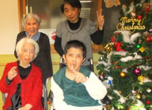 午後から夜にかけて、クリスマス会を開催しました。午後は、皆さんお待ちかねのサンタさんとトナカイによるお一人おひとりへのプレゼントタイムから始まりました。「次はだれかな」「自分かな」とわくわくしつつ、喜ばれていました。プレゼントのお渡しの後は、サンタさんとの写真撮影会が始まりました。夜はクリスマスディナーの開始。調理員が一つ一つ丁寧に仕上げた手作りのハンバーグに唐揚げ、エビフライにスパゲッティ、特製サンタさんのポテトサラダと今年も盛りだくさんのクリスマスメニューでした。クリスマスケーキの代わりに、3種のデザートとフルートのアシェットも出て、皆さんお腹いっぱいの笑顔を見せて下さっていました。 副施設長 小森