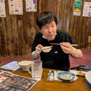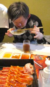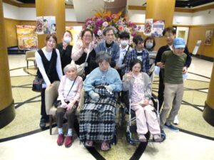 ホテルでのランチや買い物、温泉にBBQなど利用者の皆さんのリクエストを踏まえて、グループごとに分かれて行います。今年は、食事の行き先に「焼肉店」が多く、全国的に有名なチェーン店から地域の老舗の名店へと皆さんはお腹いっぱいにお肉を楽しまれました。言葉のない利用者のみなさんから要望を尋ねるのは簡単ではありませんが、日々の生活でのご様子を確認して、その一つ一つを積み重ねて、今回も職員同士で意見や思いを出し合って「誰もが楽しめる企画」となるように努めています。今回の日帰り旅行でも素敵な表情や外出後の「楽しかったわ」「おいしかったよ」「よかったわ~」「また行きたいね」と笑顔でコミュニケーションをとる姿がたくさんありました。副施設長小森