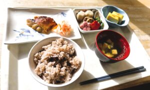 1月1日 おせちメニュー 金目鯛の西京焼き 紅白なます だし巻き卵 お赤飯 すまし汁